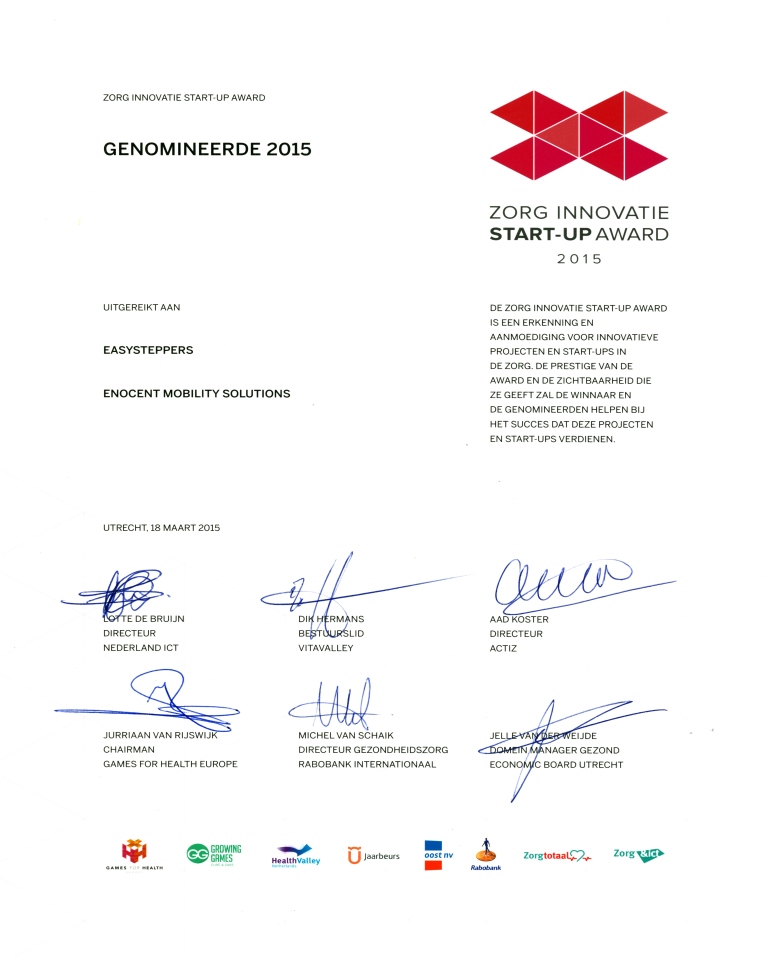 De Easysteppers zijn genomineerd op de "ZORG EN ICT BEURS" op 22 maart in de jaarbeurs in Utrecht met een startup award als erkenning en aanmoediging voor innovatieve projecten in de zorg.